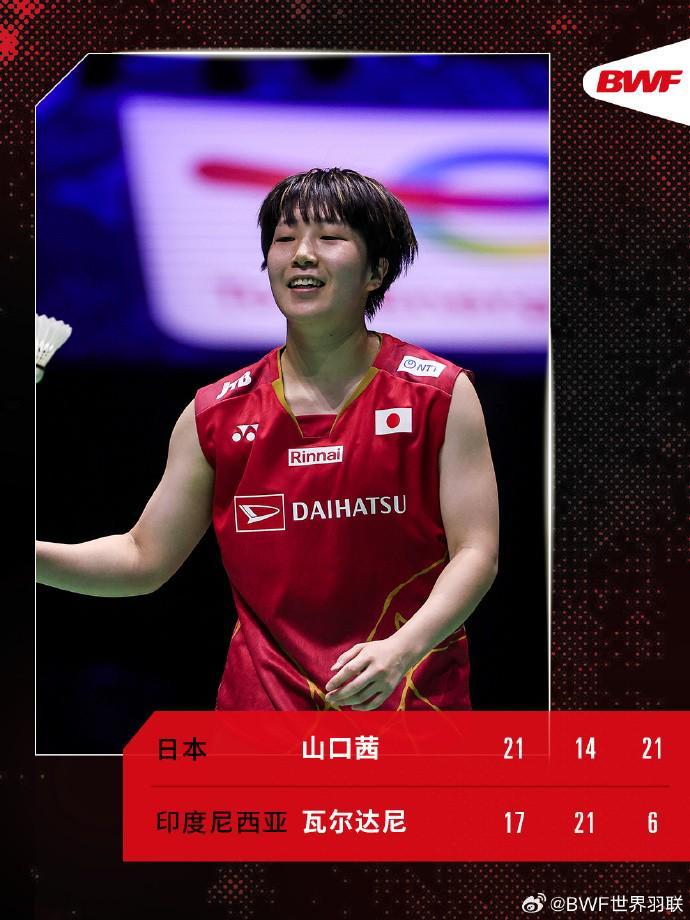 8月30日,巴黎世锦赛女单半决赛:山口茜2-1(21-17、14-21、21-6)淘汰瓦尔达尼。